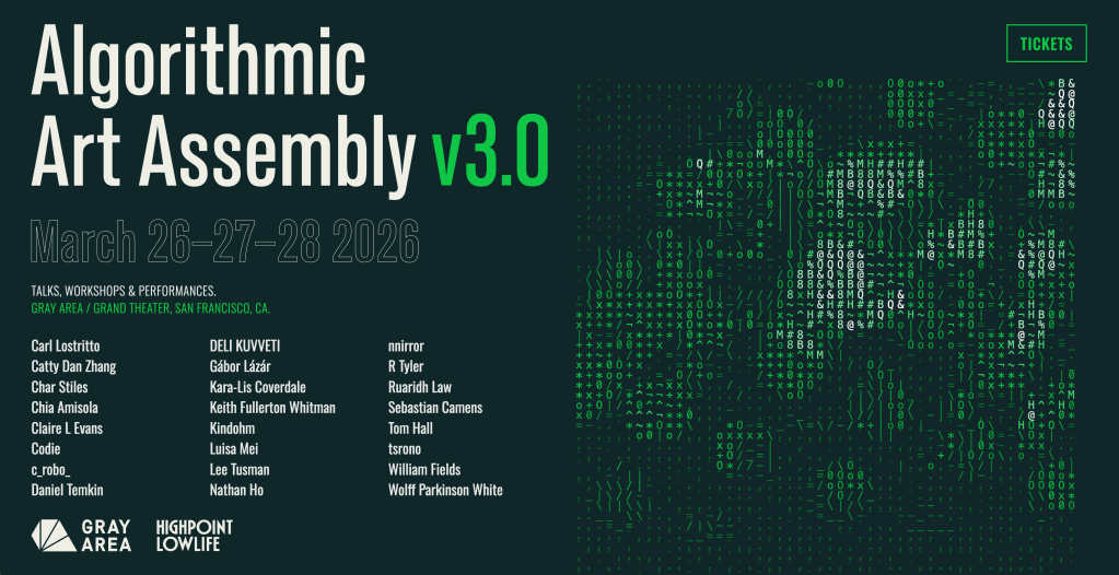 Artisanal algorithmicists and computational craftspeople ASSEMBLE! Algorithmic Art Assembly returns to Gray Area for a third edition of the hybrid conference and music festival, March 26–28, 2026.